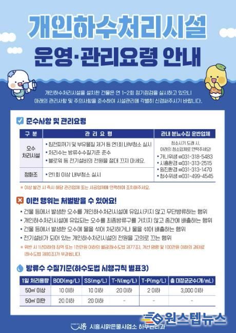 시는 개인하수처리시설의 전원 차단 여부와 송풍기 정상 작동 상태를 비롯해 방류수 수질 자가측정 이행 여부, 관리 기준 준수 여부를 점검한다. 또한 정화조와 오수처리시설의 연 1회 이상 내부 청소 이행 여부와 함께, 오수를 무단 방류하거나 비밀 배출구를 설치하는 등 불법 행위 여부도 중점적으로 살필 예정이다.