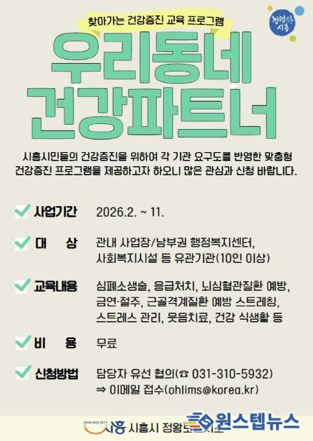 원스텝뉴스 이병희 기자 | 시흥시는 시간적ㆍ거리적 제약으로 건강증진 서비스를 이용하기 어려운 시민들을 위해 2월부터 11월까지 찾아가는 건강증진 프로그램 ‘우리동네 건강파트너’를 운영한다.