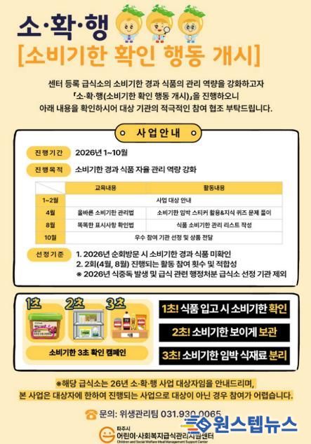 이번 사업은 센터 등록 급식소가 소비기한 경과 여부를 자율적으로 점검하고 관리할 수 있도록 지원하는 프로그램이다. 2026년에는 ‘소비기한 3초 확인 캠페인’을 운영해 상시적인 소비기한 관리를 유도하고 대상별 맞춤형 사업 운영을 통한 소비기한 경과 식품 확인 급식소 감소를 목표로 한다.