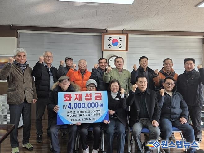 파주읍 이장협의회는 성금 전달에 앞서, 화재 직후 장비를 동원해 전소된 주택내부 시설과 폐기물을 정리하는 등 신속한 복구 지원에도 나섰다.