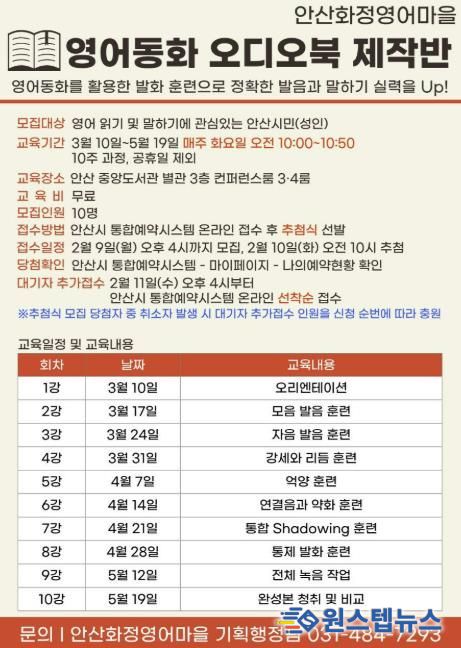 원스텝뉴스 이병희 기자 | 안산시가 설립하고 안산대학교가 운영하는 안산화정영어마을이 성인 영어 학습자를 위한 ‘영어동화 오디오북 제작반’을 3월부터 5월까지 10주 과정으로 안산시 중앙도서관에서 운영한다고 4일 밝혔다.