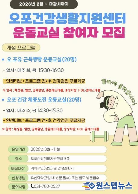 참여를 희망하는 시민은 오포건강생활지원센터로 전화 예약 후 3일 이내 방문 접수하거나 직접 방문해 신청하면 된다.