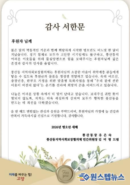 원스텝뉴스 이병희 기자 | 고양특례시 일산동구 풍산동 지역사회보장협의체는 설명절을 앞둔 지난 3일 지난해 지역사회의 어려운 이웃을 위해 따뜻한 나눔을 실천한 후원자들에게 감사의 마음을 담은 서한문을 발송했다.