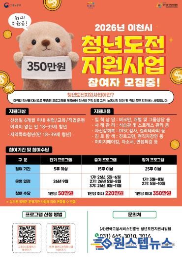 원스텝뉴스 이병희 기자 | 이천시는 지역 내 미취업 청년들의 진로 탐색과 취업역량 강화를 위해 운영하는 ‘청년도전지원사업’의 참여자를 2월 4일부터 모집한다고 밝혔다.