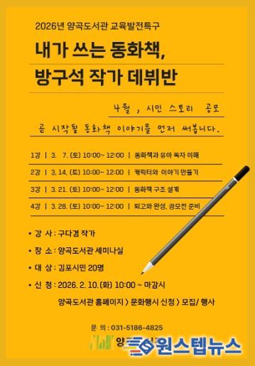원스텝뉴스 천규영 기자 | 김포시 양곡도서관은 오는 3월 7일부터 3월 28일까지 매주 토요일, 시민을 대상으로 한 그림책 글쓰기 수업 '내가 쓰는 동화책, 방구석 작가 데뷔반'을 운영한다.