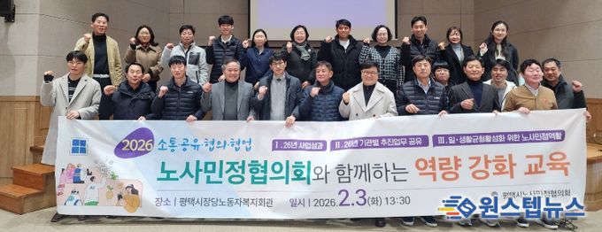 원스텝뉴스 이병희 기자 | 평택시노사민정협의회는 지난 3일 분과위원회 및 실무협의회 위원을 대상으로 '2026년 노사민정협의회 통합회의 및 일·생활 균형을 위한 역량 강화 교육'을 평택시 장당노동자복지회관 대회의실에서 개최했다.