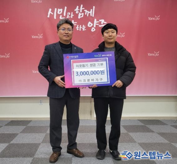 원스텝뉴스 이병희 기자 | (주)크로바가구는 지난 3일 겨울철을 맞아 지역 내 취약계층과 소외된 이웃을 돕기 위해 성금 300만 원을 회천1동 행정복지센터에 전달했다.