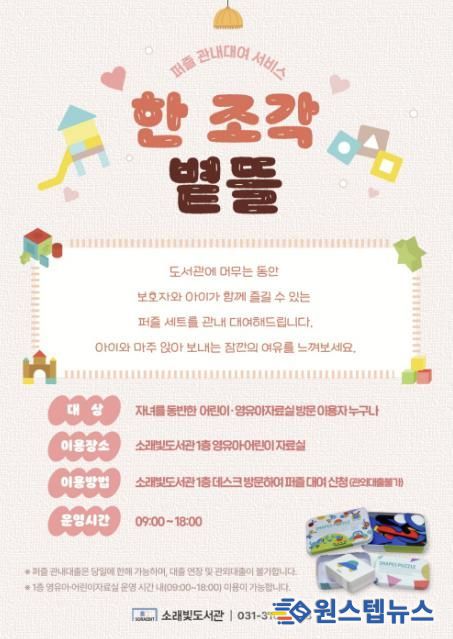 김혜순 소래빛도서관장은 “‘한 조각 볕뜰’은 아이들이 한자리에 머물며 차분히 몰입할 수 있는 시간을 제공하고자 기획한 서비스”라며, “부모와 아이가 함께 퍼즐을 맞추며 도서관에서의 경험이 더 깊어지길 기대한다”라고 말했다.