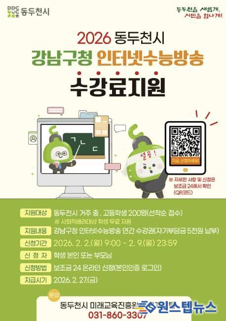 원스텝뉴스 이병희 기자 | 동두천시는 사교육비 부담을 경감하고 교육 격차를 해소하기 위해 관내에 거주하는 중·고등학생을 대상으로 강남구청 인터넷수능방송 연간 수강료 지원 사업을 추진하고 있다.