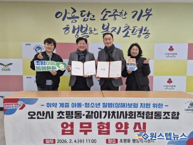 원스텝뉴스 이병희 기자 | 오산시 초평동 행정복지센터는 지난 4일 지역 내 차상위계층 청소년과 아동의 건강한 성장 지원과 의료비 부담 완화를 위해 같이가치사회적협동조합과 질병(상해)보험료 지원을 위한 업무협약을 체결했다고 밝혔다.