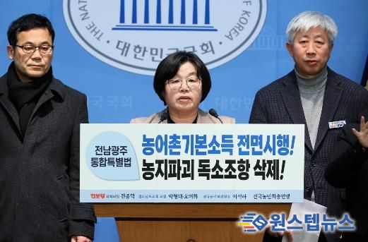 원스텝뉴스 이병희 기자 | 전라남도의회 오미화 의원(진보당ㆍ영광2)은 지난 3일, 국회 소통관에서 전남ㆍ광주 통합 특별법과 관련해 농지파괴가 우려되는 조항의 삭제와 농어촌기본소득 전면 시행을 요구하는 기자회견을 열었다.