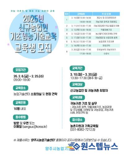 원스텝뉴스 이병희 기자 | 양주시는 농촌지역으로 이주한 귀농․귀촌인과 예비 귀농인의 안정적인 농촌 정착을 지원하기 위해 ‘2026년 신규농업인 기초영농기술교육’ 교육생을 모집한다.