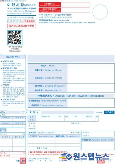 원스텝뉴스 이병희 기자 | 이천시는 맞춤형 세무 행정 실현과 다문화 포용 정책 추진사업의 일환으로 경기도 최초 외국인 대상 다국어(영어·중국어·베트남어) 세외수입 체납고지서를 발송하고, 언어장벽으로 인한 세무 행정 사각지대 해소에 나선다고 밝혔다.