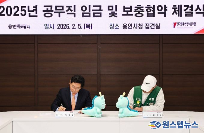 원스텝뉴스 이병희 기자 | 용인특례시는 5일 시청 접견실에서 시 소속 공무직 근로자를 대표하는 전국민주연합노동조합 용인지부와 ‘2025년 공무직 임금·보충 협약’을 체결했다고 밝혔다.