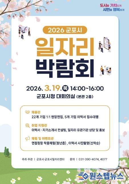 원스텝뉴스 천규영 기자 | 군포시는 오는 3월 19일 오후 2시부터 시청 대회의실에서 ‘2026년 군포시 일자리 박람회’를 개최함에 따라 2월 10일부터 2월 27일까지 박람회에 참여할 기업체를 모집한다.