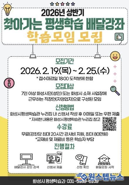 원스텝뉴스 이병희 기자 | 화성특례시는 2월 19일부터 2월 25일까지 2026년 상반기'찾아가는 평생학습 배달강좌'학습모임을 모집한다.