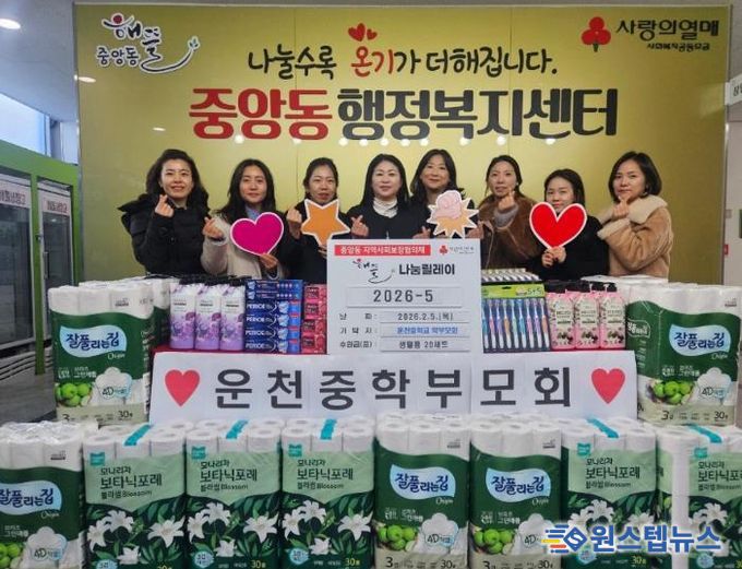 백경희 중앙동장은 “지역사회를 위해 이웃사랑을 실천해 주신 운천중학교 학부모회에 깊이 감사드린다”며 “기탁해 주신 물품은 정성 어린 마음을 담아 도움이 필요한 어르신들께 소중히 전달하겠다”고 밝혔다.