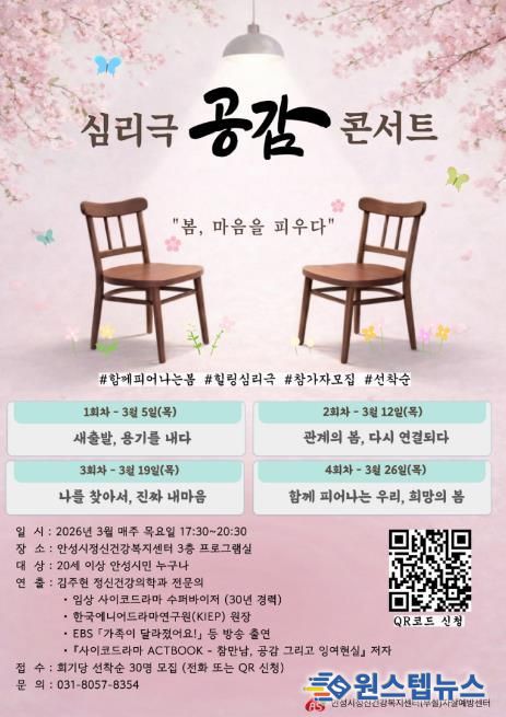 원스텝뉴스 이병희 기자 | 안성시보건소 안성시정신건강복지센터(부설 자살예방센터)는 시민의 정신건강 증진과 생명존중 문화 조성을 위해 심리극(사이코드라마) 기법을 활용한 체험형 집단 프로그램 '공감' 콘서트를 오는 3월 운영한다고 밝혔다.