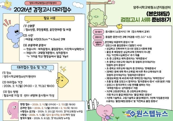 원스텝뉴스 이병희 기자 | 양주시학교밖청소년지원센터에서는 학교 밖 청소년들을 위해 2026년 제1회 초중고 졸업 학력 검정고시 응시 원서 접수 대행을 지원한다.