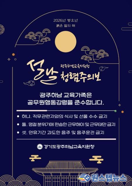 원스텝뉴스 이병희 기자 | 경기도광주하남교육지원청은 2월 9일, 2026년 병오년 설명절을 맞아 관내 교직원들이 청렴한 마음가짐으로 새해를 시작할 수 있도록‘교육장 청렴서한문’과‘청렴주의보’를 각급 학교에 전달했다.