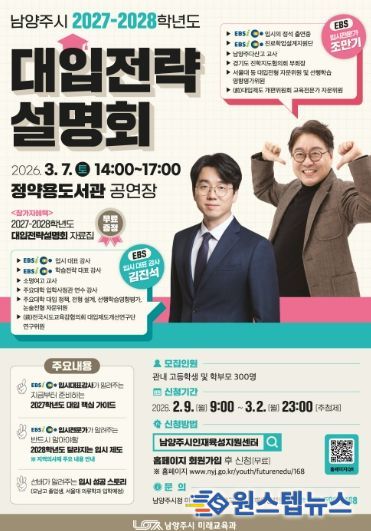 원스텝뉴스 천규영 기자 | 남양주시는 오는 3월 7일 정약용도서관 공연장에서 관내 고등학생과 학부모를 대상으로 ‘남양주시 2027~2028학년도 대입전략설명회’를 열고, 이에 앞서 2월 9일부터 참가 신청 접수를 진행한다.