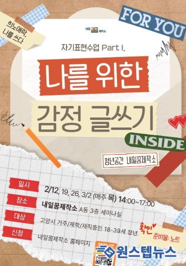 원스텝뉴스 이병희 기자 | 고양특례시는 오는 2월 12일부터 매주 목요일 4주간, 고양시 청년공간‘내일꿈제작소’에서 관내 청년들의 마음돌봄을 위한‘감정글쓰기’프로그램을 진행한다고 밝혔다.