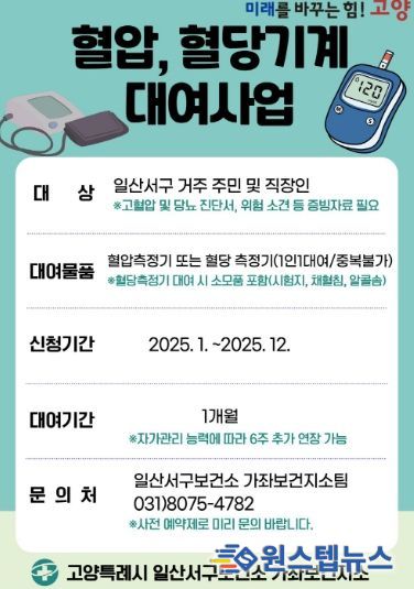 원스텝뉴스 이병희 기자 | 고양특례시 일산서구보건소 가좌보건지소는 일산서구 주민들 중 고혈압, 당뇨 유질환자이거나 전 단계 소견을 받은 주민들을 대상으로 혈압·혈당계 대여사업을 진행한다고 밝혔다.