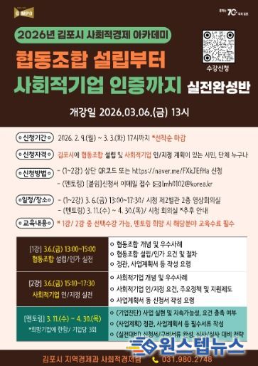 원스텝뉴스 이병희 기자 | 김포시가 사회문제 해결을 위한 참신한 아이디어와 실행력을 갖춘 사회적경제기업 육성을 위해 ‘2026년 김포시 사회적경제 아카데미’를 개설하고, 오는 3월 3일까지 수강생을 모집한다.
