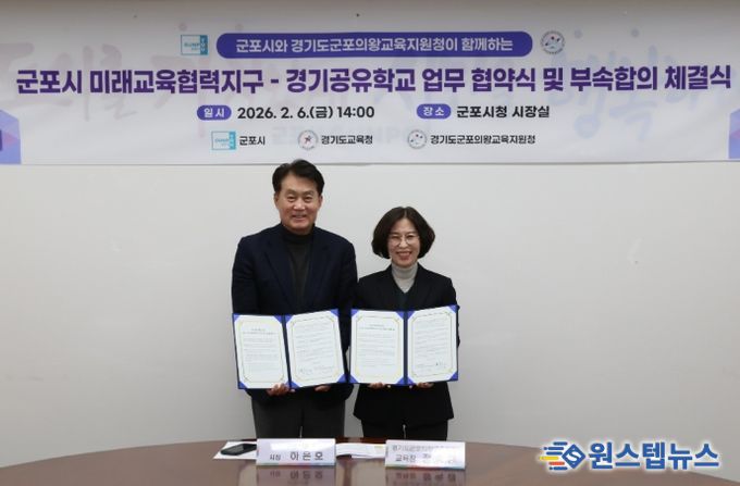 원스텝뉴스 이병희 기자 | 군포의왕교육지원청과 군포시청은 2월 6일 군포시청에서 '2026 군포시 미래교육협력지구-경기공유학교 업무협약식 및 부속합의서'를 체결했다.