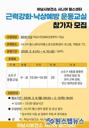 원스텝뉴스 이병희 기자 | 하남시보건소는 오는 2월 9일부터 12일까지 시니어를 대상으로 ‘2026년 근력강화,낙상예방 운동교실 1기’ 참여자를 모집한다.