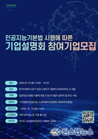 원스텝뉴스 이병희 기자 | 경기도가 지난 1월 22일 시행된 ‘인공지능 기본법’에 대한 도내 기업들의 이해를 돕기 위해 10일 오후 2시 판교 경기AI캠퍼스에서 AI 기업 대상 설명회를 개최한다.