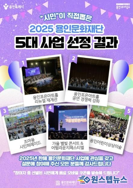 원스텝뉴스 이병희 기자 | 용인문화재단은 시민 참여 온라인 투표를 통해 ‘시민이 선정한 2025년 용인문화재단 5대 사업’을 발표했다.