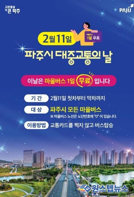 원스텝뉴스 이병희 기자 | 파주시는 ‘대중교통의 날’을 맞아 대중교통 이용 활성화와 시민 교통비 부담 완화를 위해 오는 2월 11일 하루 동안 파주시 전 지역의 모든 마을버스를 무료로 운행한다.