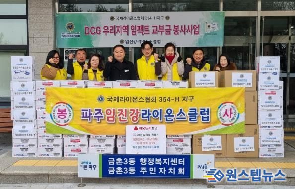 이에 전종고 금촌3동장은 경기 침체 등 기부 여건이 어려웠음에도 불구하고“지역사회를 위해 꾸준히 온정을 베풀어 주시는 파주임진강라이온스클럽에 깊이 감사드린다”라며 “기탁해 주신 소중한 물품은 도움이 필요한 가정에 따뜻한 마음과 함께 정성껏 전달하겠다”라고 말했다.