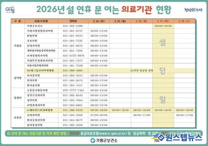 가평군 관계자는 “설 연휴 기간에도 군민들이 안심하고 의료 서비스를 이용할 수 있도록 응급의료체계 운영에 최선을 다하겠다”며 “군민들께서는 문 여는 의료기관과 약국을 미리 확인하고 갑작스러운 상황에 대비해 모두가 행복하고 안전한 명절을 보내시기 바란다”고 말했다.
