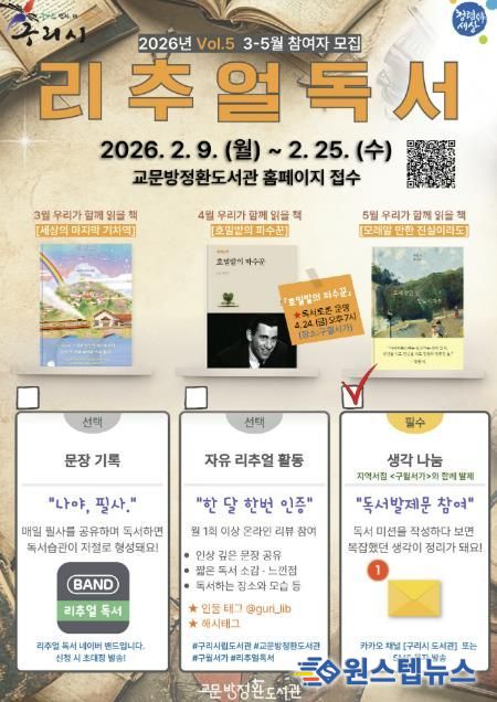 원스텝뉴스 이병희 기자 | 구리시 교문방정환도서관은 매월 한 권의 책을 시민과 함께 읽는 참여형 독서프로그램 '리추얼 독서'의 올해 첫 참여자를 오는 2월 9일부터 모집한다고 밝혔다.