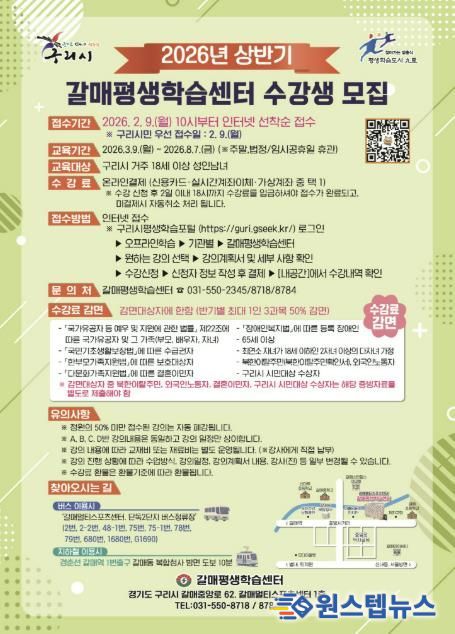 원스텝뉴스 이병희 기자 | 구리시는 구리시평생학습관, 갈매평생학습센터, 수택평생학습센터에서 운영하는 2026년 상반기 평생학습 강좌의 수강생을 오는 2월 9일부터 모집한다고 밝혔다.