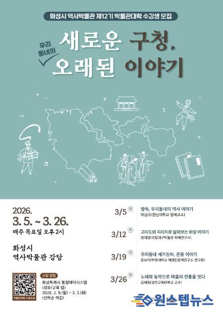 강의는 화성시 역사박물관 1층 강당에서 진행되며, 지역 주민을 비롯해 역사와 문화에 관심 있는 성인이면 누구나 참여할 수 있다. 수강 정원은 60명으로, 2월 9일부터 화성특례시 통합예약시스템을 통해 선착순으로 접수한다.