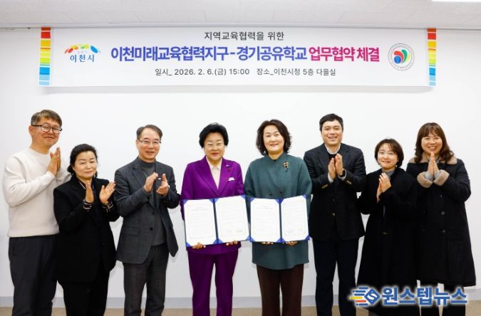 원스텝뉴스 이병희 기자 | 이천시는 2월 6일, 2026년도 이천미래교육협력지구(경기공유학교 학교맞춤형) 사업의 원활한 추진을 위해 이천교육지원청과 ‘이천미래교육협력지구-경기공유학교 업무협약’을 체결했다고 밝혔다.