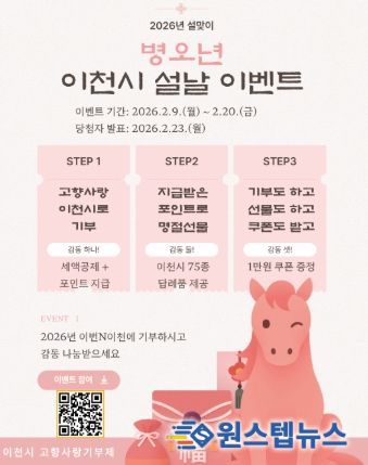 원스텝뉴스 이병희 기자 | 이천시는 설 명절을 맞아 고향을 응원하는 따뜻한 마음이 기부로 이어질 수 있도록, 고향사랑기부제와 연계한 ‘설 명절 감동 나눔 이벤트’를 추진한다고 밝혔다.
