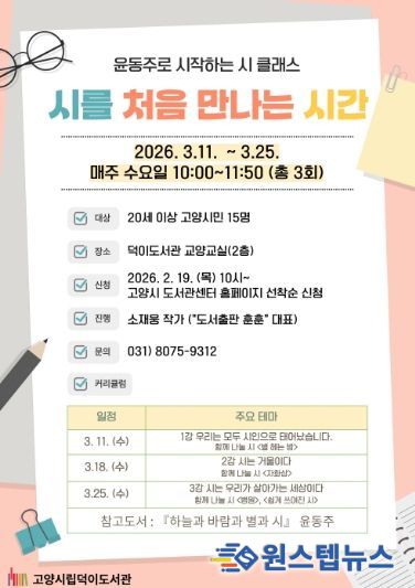 원스텝뉴스 천규영 기자 | 고양특례시 덕이도서관은 시민들에게 시를 통해 자신의 내면을 성찰하고 감성을 키울 수 있는 프로그램‘시를 처음 만나는 시간'을 운영한다.