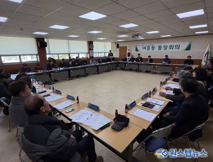 원스텝뉴스 이병희 기자 | 여주시 여흥동은 6일 오전, 행정복지센터 2층 회의실에서 제10대 김광덕 부시장과 함께하는 2월 1차 통장회의를 개최했다. 회의에는 김광덕 부시장, 김영완 여흥동장, 정지남 홍문지구대장, 이병길 여주농협조합장 및 33개 마을 통장이 참석했다.