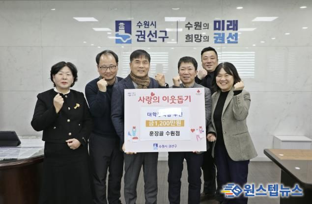 원스텝뉴스 이병희 기자 | 수원시 권선구는 지난 9일 훈장골 수원점(대표 이정관)이 후원하는 ‘대학입학예정자 등록금’ 전달식을 가졌다.