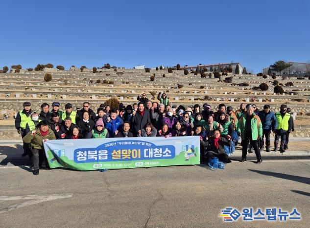 원스텝뉴스 이병희 기자 | 평택시 청북읍 행정복지센터는 지난 9일 이장협의회, 주민자치회, 새마을남․여지도자, 의용소방대 등 5개 단체 회원과 청북읍 행정복지센터 직원 등 총 60여 명이 참여한 가운데 청북공설공원묘지에서 ‘우리동네 새 단장’을 위한 설맞이 민관합동 대청소를 진행했다.