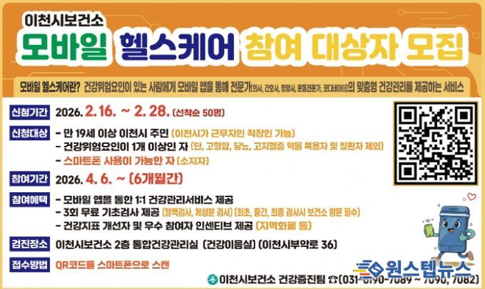 원스텝뉴스 이병희 기자 | 이천시는 스마트폰을 활용한 맞춤형 건강관리 서비스를 제공하는 모바일 헬스케어 사업 대상자를 2월 16일부터 2월 28일까지 선착순으로 모집한다.