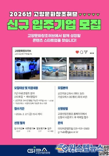 신청은 고양문화창조허브 전자우편으로 가능하며, 평가를 거쳐 3월 중 최종 기업을 선정해 4월부터 입주할 예정이다.