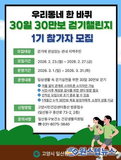 원스텝뉴스 이병희 기자 | 고양특례시 일산동구보건소는 지역 주민의 기초 체력 증진과 신체활동 활성화를 위해 기획한‘우리동네 한 바퀴 30일 30만보 걷기 챌린지’1기 참가자를 오는 23일부터 모집한다.
