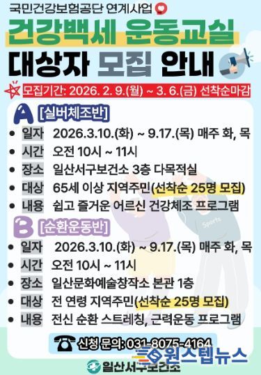 일산서구보건소 관계자는 “지역주민이 일상 속에서 꾸준히 운동할 수 있는 환경을 조성하고, 연령별 맞춤형 신체활동 프로그램을 통해 건강한 노후와 활기찬 생활을 지원하고자 한다”며 “많은 시민들의 관심과 참여를 바란다”고 전했다.