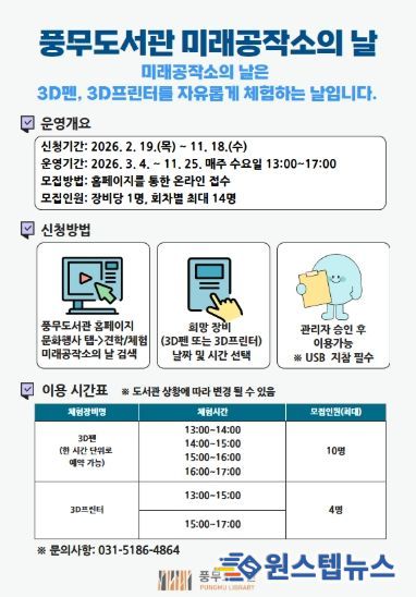 원스텝뉴스 천규영 기자 | 김포시 풍무도서관은 특화공간인 미래공작소를 개방하는 ‘미래공작소의 날’을 오는 3월 4일부터 11월 25일까지 매주 수요일 오후 1시부터 5시까지 운영한다.