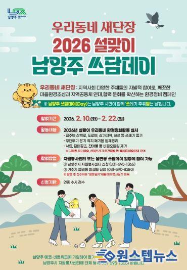 원스텝뉴스 이병희 기자 | 남양주시는 10일부터 22일까지 시 전역에서 ‘설맞이 우리동네 새단장 남양주 쓰담데이 집중 추진기간’을 운영한다고 밝혔다.